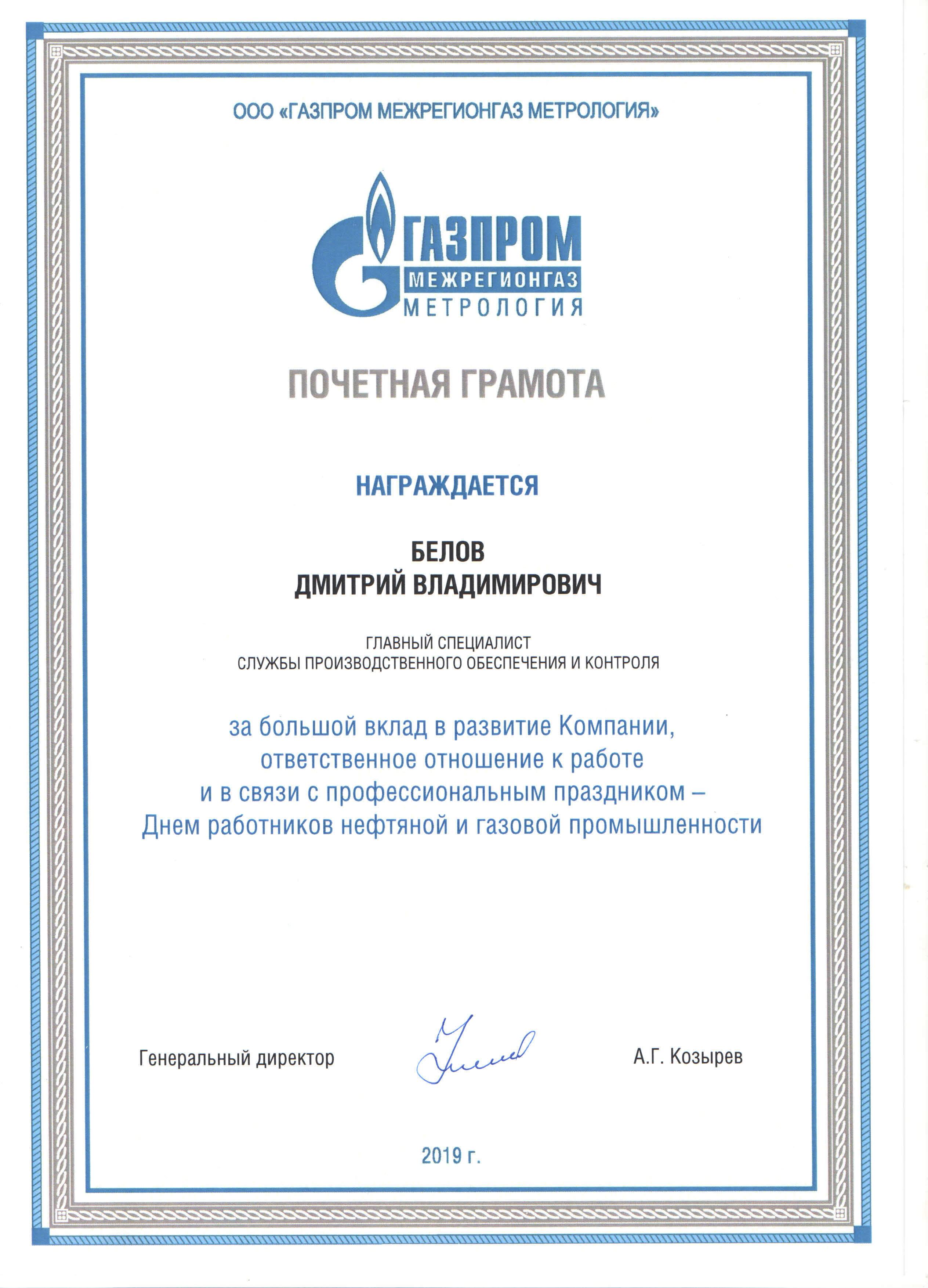 Почетная грамота за большой вклад в развитие Компании, ответственное отношение к работе и в связи с профессиональным праздником – Днем работников нефтяной и газовой промышленности